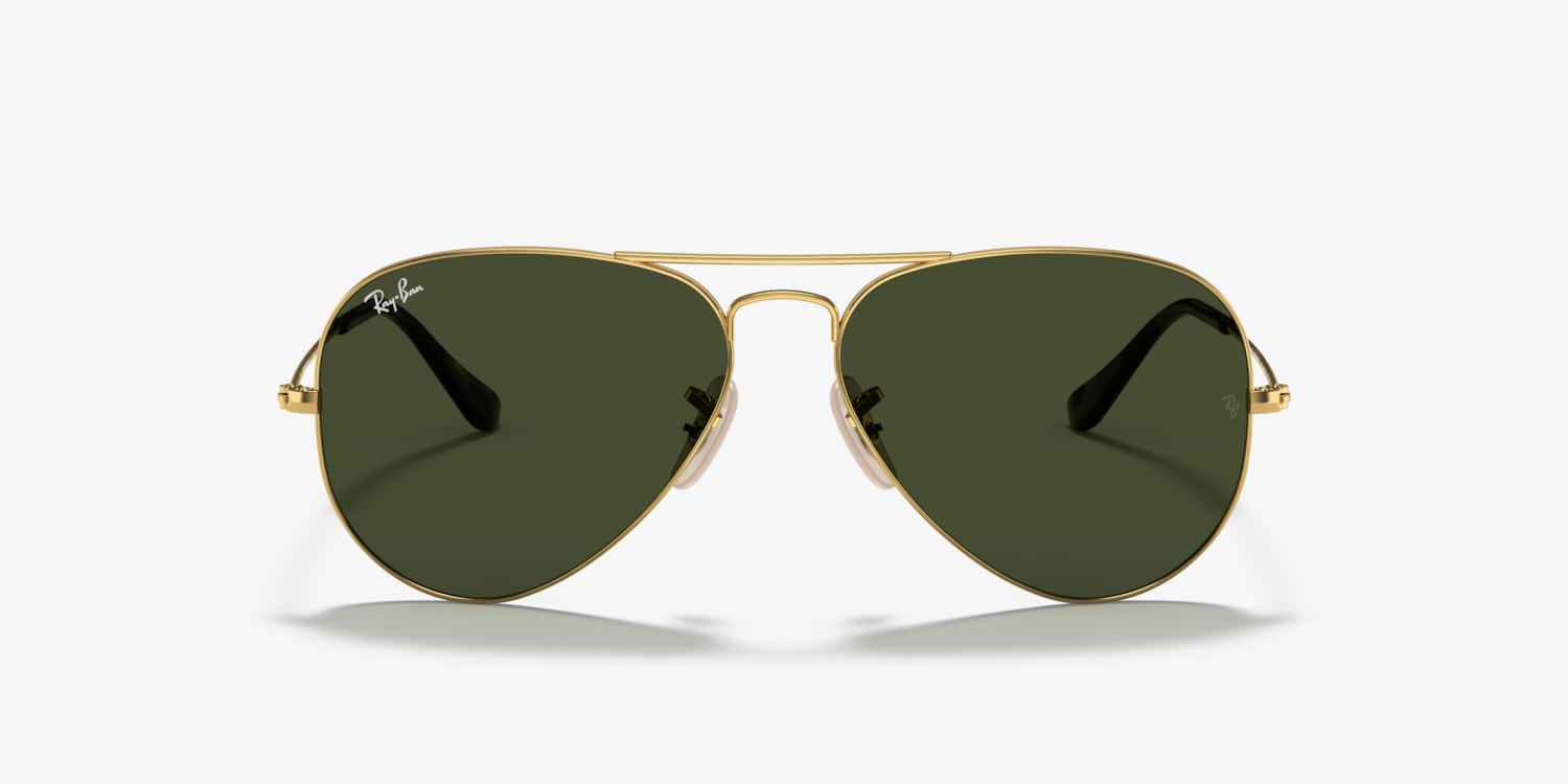 Experience the perfect blend of classic and contemporary style with Ray-Ban Aviator Havana sunglasses. The gold metal pilot shape frame, paired with classic green lenses, exudes a timeless appeal. The polished finish adds a touch of sophistication to these iconic shades. Crafted from durable metal, these glasses are designed to last. Choose this pair for a versatile and stylish look. Available with prescription lenses.