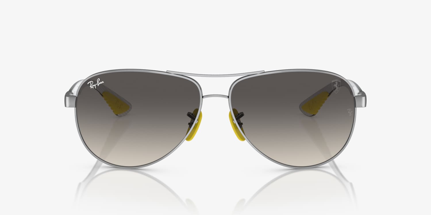 Ray-Ban RB8331M Scuderia Ferrari Collection sunglasses are a perfect blend of style and performance. The pilot shape and polished silver frame, crafted from durable metal, exude a timeless appeal. The gradient grey lenses add a touch of sophistication, while the black detailing on the temple adds a sporty touch. These shades deliver both style and comfort. Available with prescription lenses.