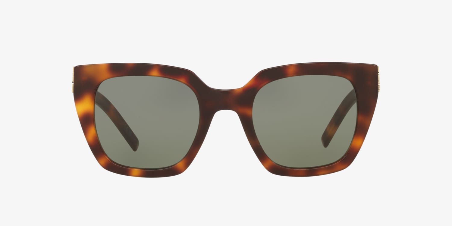 The Saint Laurent SL M143 sunglasses exude timeless elegance with their cat-eye plastic frames in a tortoise hue. Designed with full-rim definition and crafted with durable acetate temples, these tortoise sunglasses offer both style and reliability. Solid green lenses add a sophisticated contrast, perfect for everyday wear.