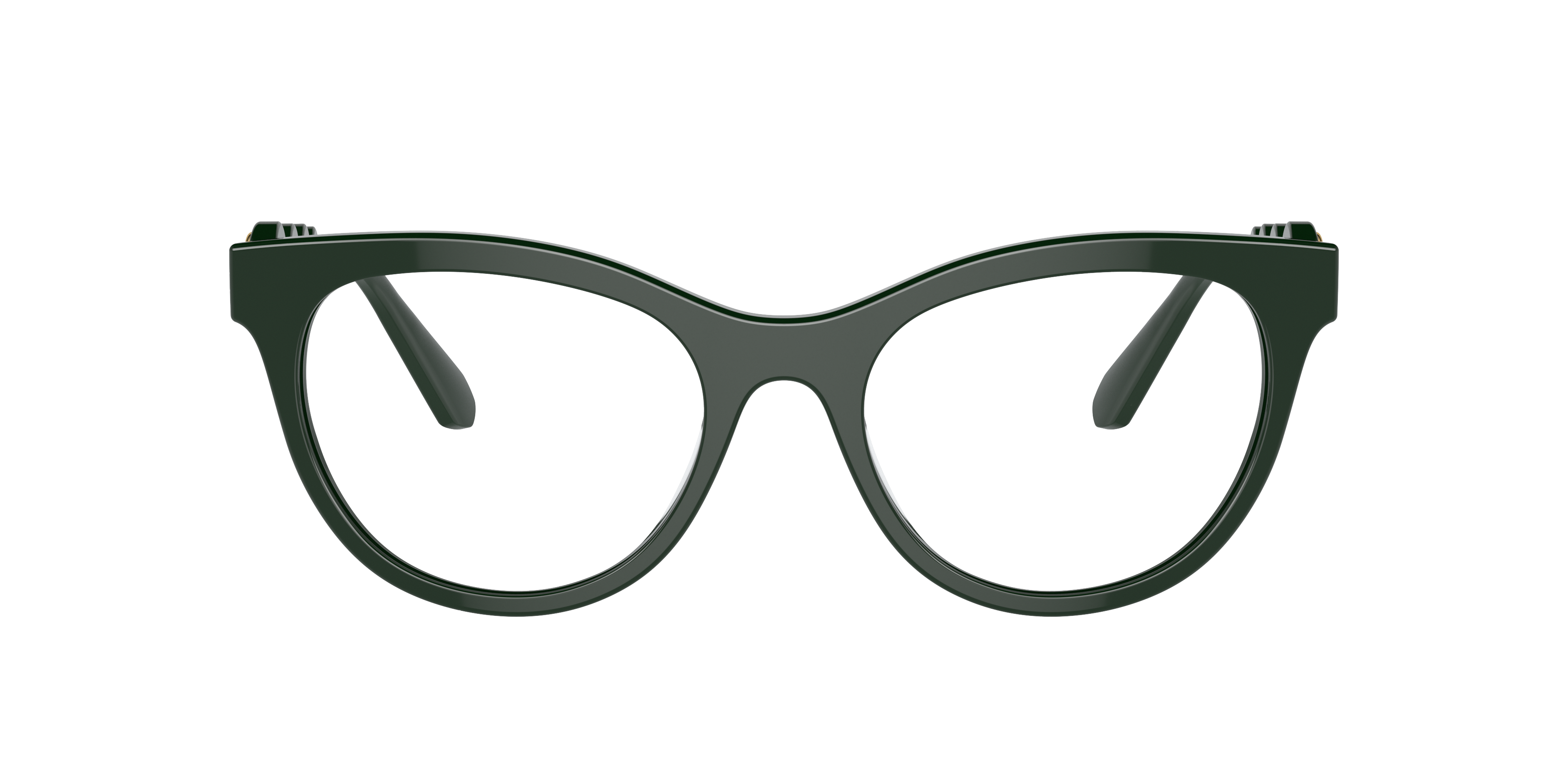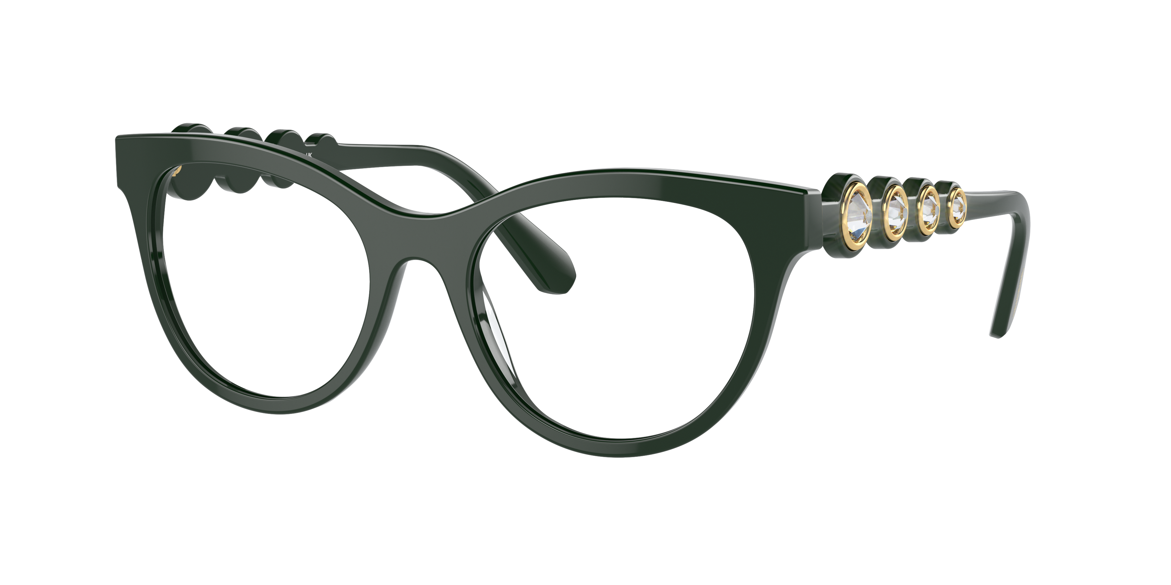 Swarovski SK2025 Optical are a perfect blend of style and functionality. The round shape and dark green frame color, made from acetate material, give these glasses a vintage feel. The polished finish adds a touch of sophistication, while the strass detailing adds some sparkle to your look. Wear these frames with any outfit for a trendy and chic aesthetic. Available with prescription lenses.
