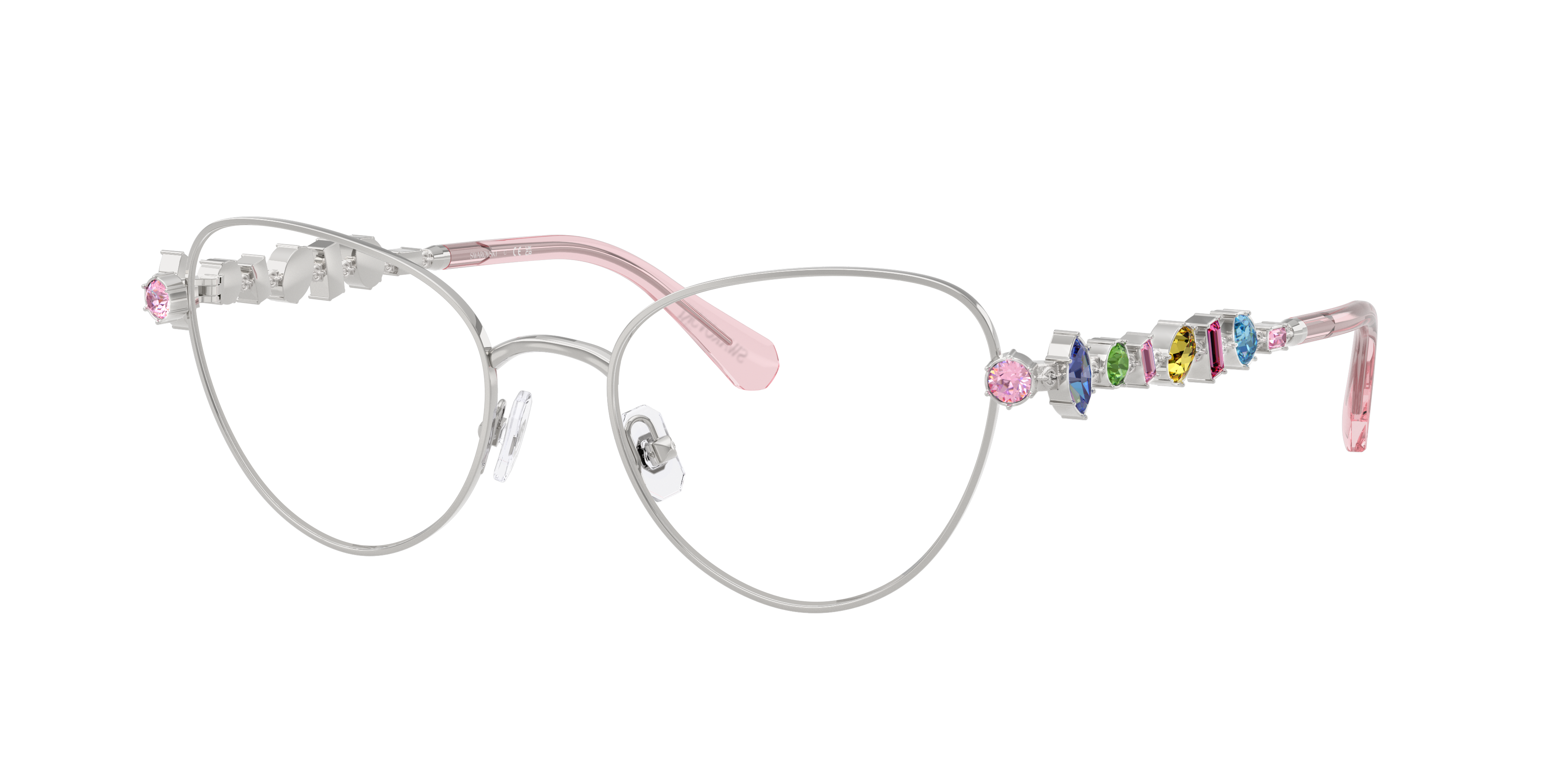 Elevate your style and optical performance with Swarovski SK1024. These cay-eye frames are crafted from durable metal, featuring a polished silver finish that adds a touch of glamour to any look. The strass detailing on the frame adds a touch of elegance. These glasses are not only stylish but also versatile, making them an ideal choice for everyday wear. Available with prescription lenses.