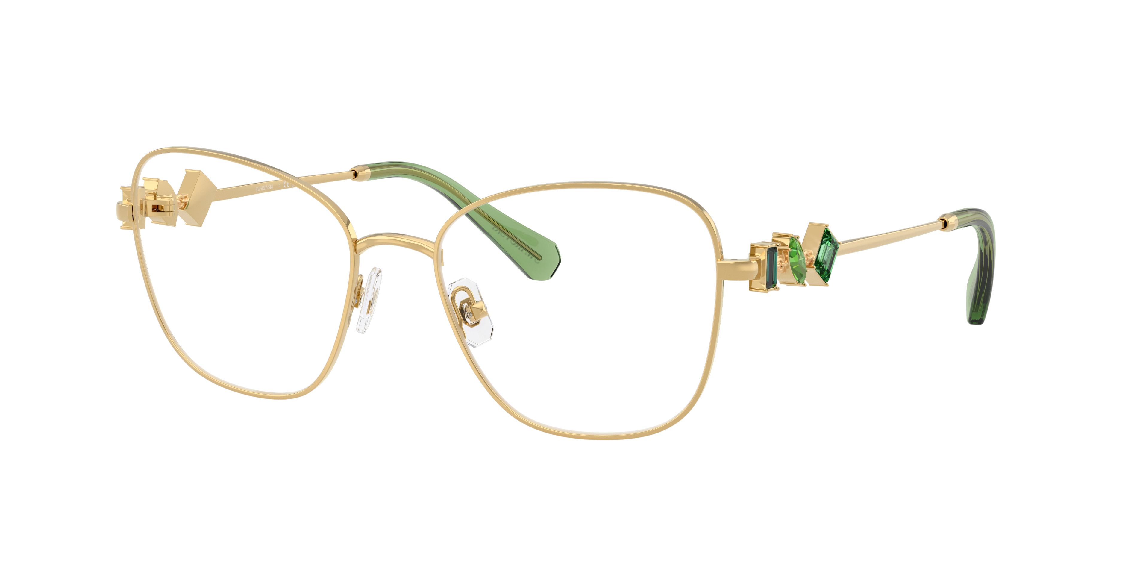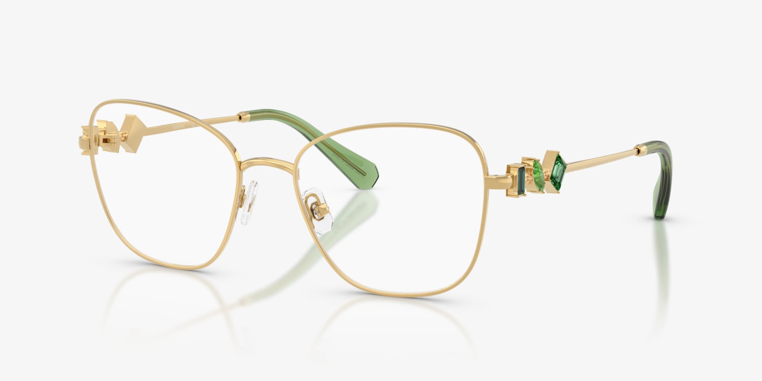 Experience the unique synergy of style and optical performance in Swarovski SK1025. The irregular shape adds a touch of edginess to these glasses, while the polished gold metal frame offers a luxurious look. Strass adorns the frame, creating a dazzling effect that is sure to turn heads. These frames are not only stylish but also versatile, making them an excellent choice for everyday wear. Available with prescription lenses.