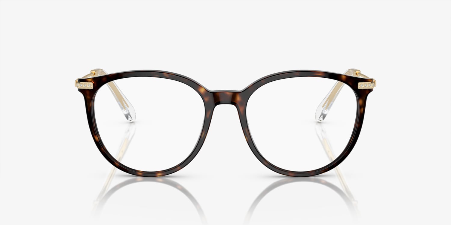 Elevate your style quotient with Swarovski SK2009 eyeglasses. The polished dark havana frame, crafted from durable acetate, features a unique phantos shape that adds a touch of glamour to your look. Strass detailing adds a touch of elegance and sophistication. These eyeglasses are not just stylish but also functional. Available with prescription lenses.