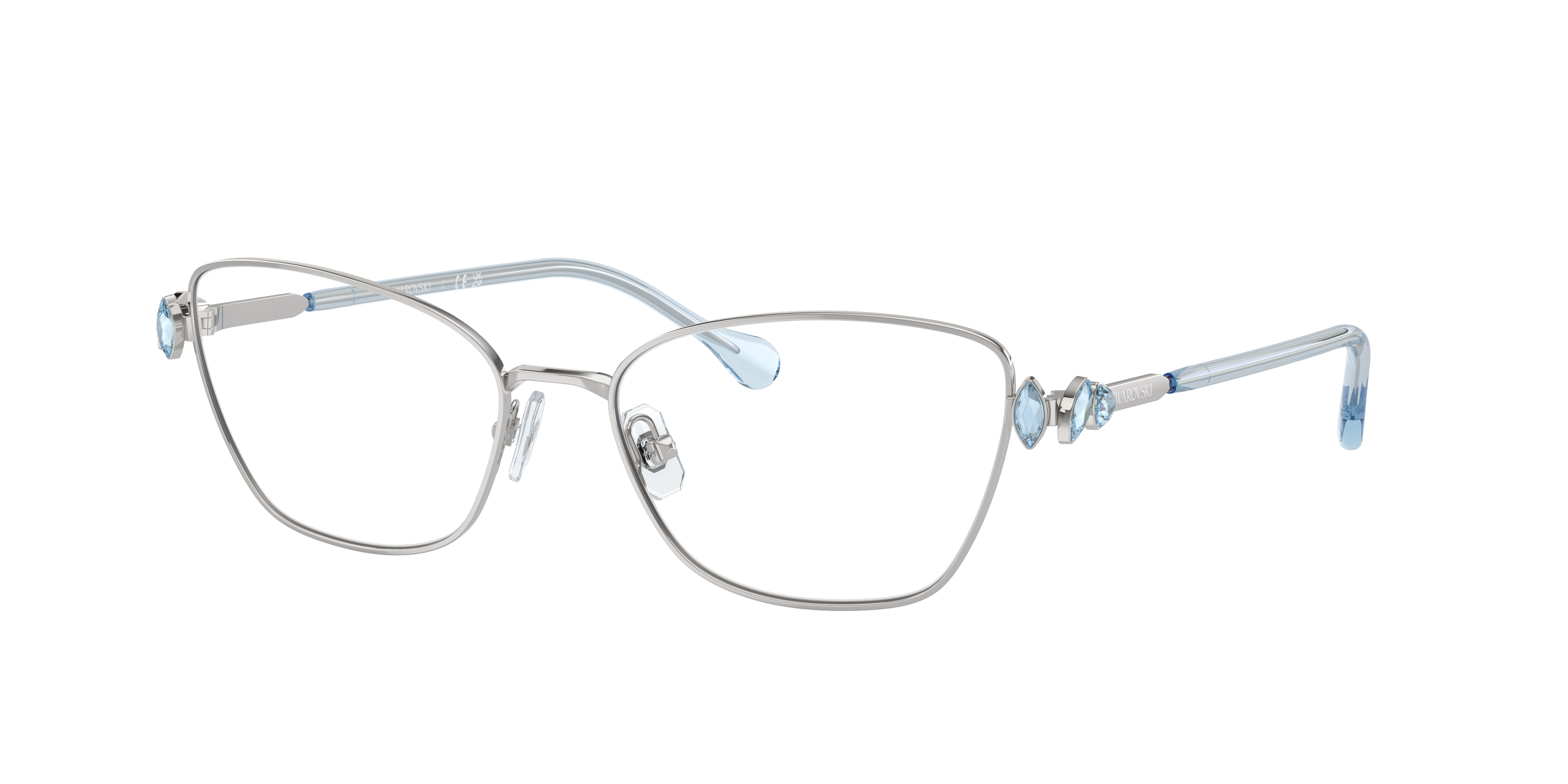 Swarovski SK1006 eyeglasses are a perfect blend of sophistication and elegance. The polished metal frame, in a unique pillow shape, with its silver hue is adorned with delicate strass for added sparkle and shine. These eyeglasses provide not only style but also comfort for everyday wear. Embrace the glamour and sophistication that Swarovski represents with these unique shades in an elegant silver frame.