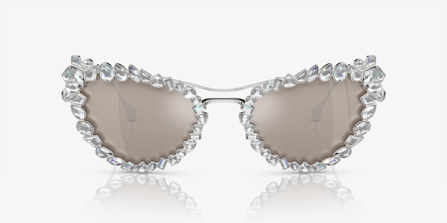 Experience the epitome of luxury with Swarovski SK7011. The irregular shape and polished metal frame, in a stunning silver color, are adorned with strass for a touch of glamour. The lens treatment features solid color - mirror in a clear mirror real platinum shade, adding an extra layer of sophistication. Embrace the elegance and style that these sunglasses offer.