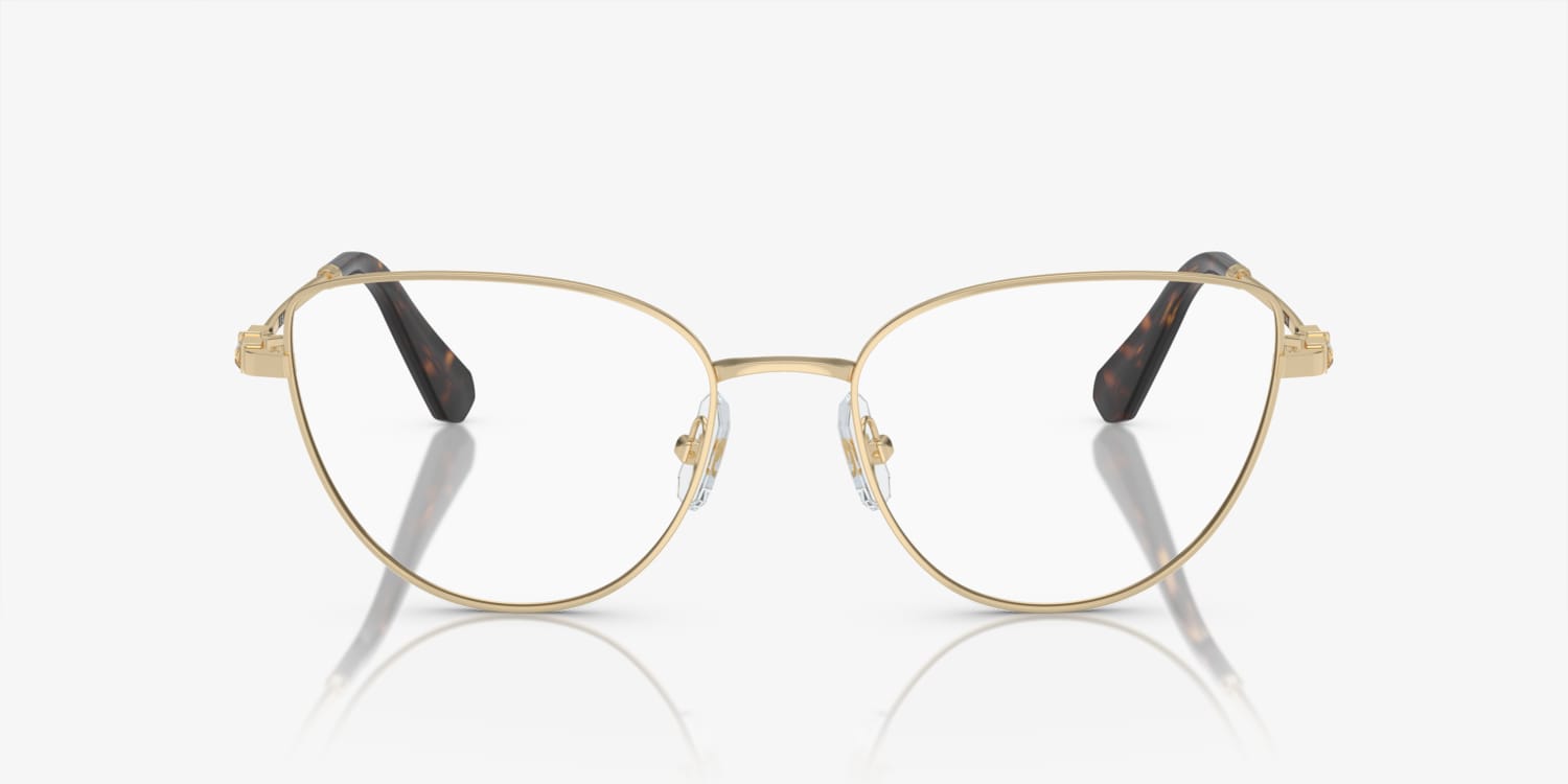 Elevate your fashion quotient with the Swarovski SK1007 eyeglasses. The polished metal frame in a unique cat eye shape is enhanced by strass details, adding a touch of luxury to your look. These glasses come in a pale gold color that complements any outfit and adds a touch of elegance to any face type. With these frames, you can show off your style while also enhancing your vision. Available with prescription lenses.