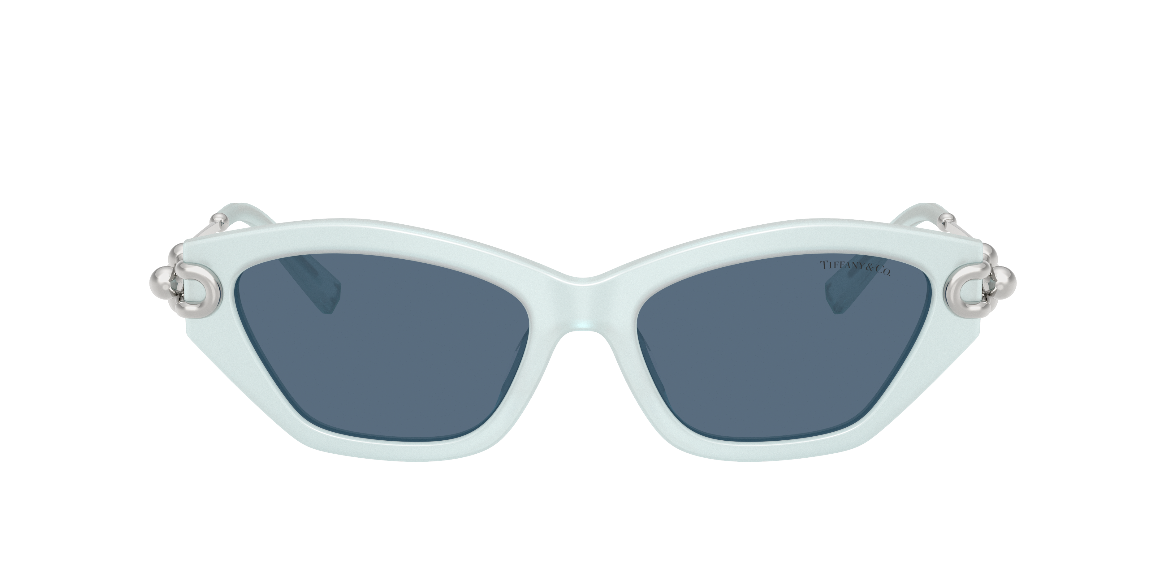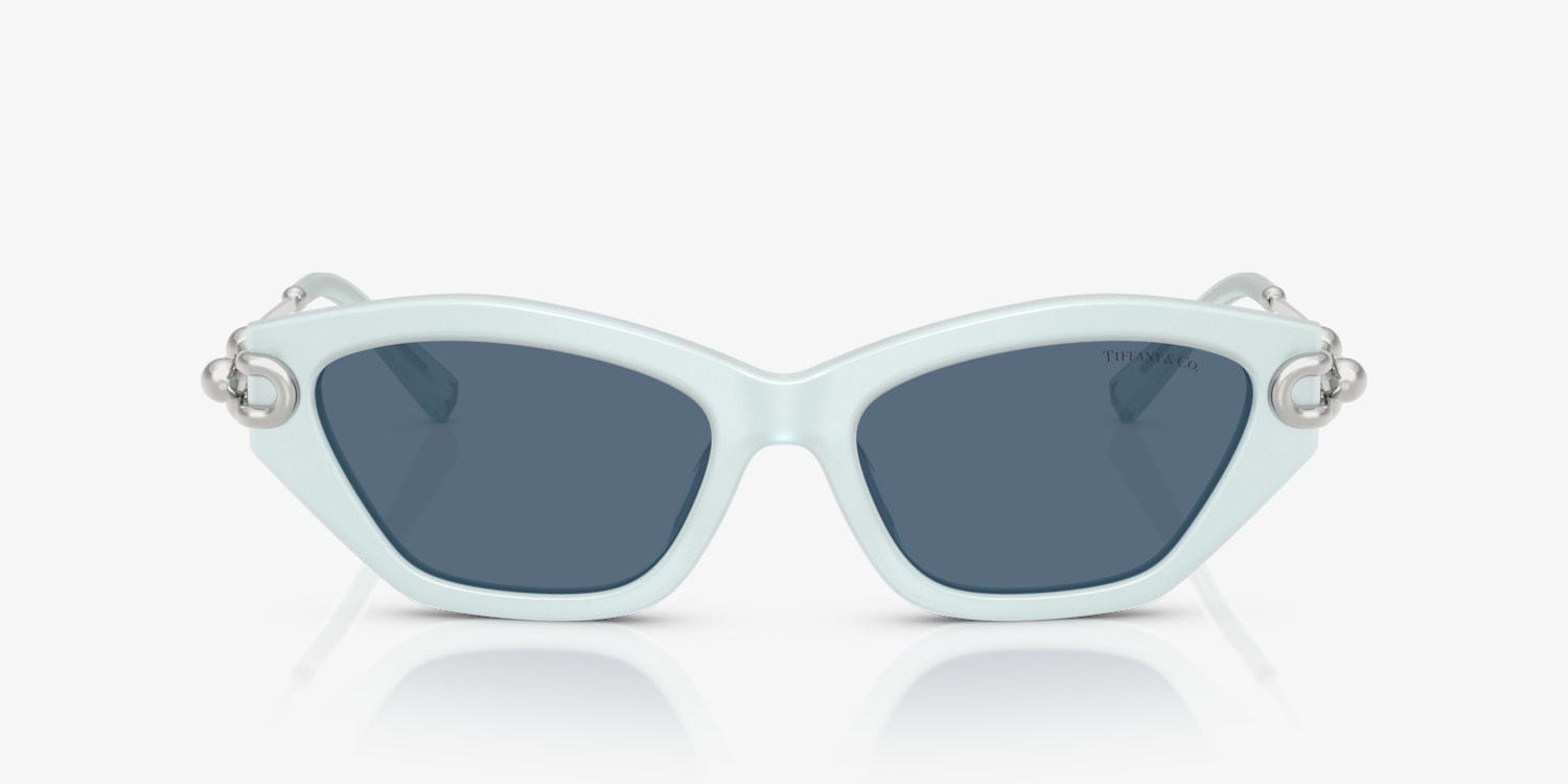 Elevate your style with Tiffany & Co. TF4231U. These cay-eye glasses are crafted from acetate, known for its durability and lightweight comfort. The frame features a polished finish in frosted pale sapphire, complemented by dark blue lenses for added contrast and intrigue. Embrace the sophistication of this timeless design that is sure to turn heads wherever you go. Available with prescription lenses.