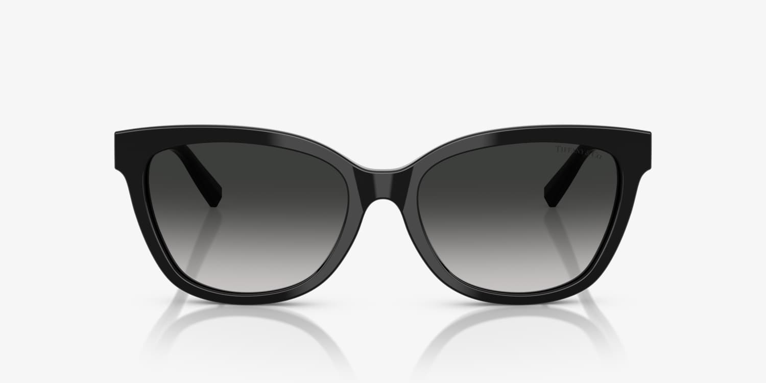 Experience the epitome of luxury with Tiffany & Co. TF4237B shades. These cat-eye sunglasses feature a polished black acetate frame that is adorned with strass, adding a touch of glamour to your look. The grey gradient lenses not only provide excellent protection but also add a stylish flair to these eyewear. Capture everyone's attention and make a bold fashion statement with this glamorous pair of glasses from Tiffany & Co..