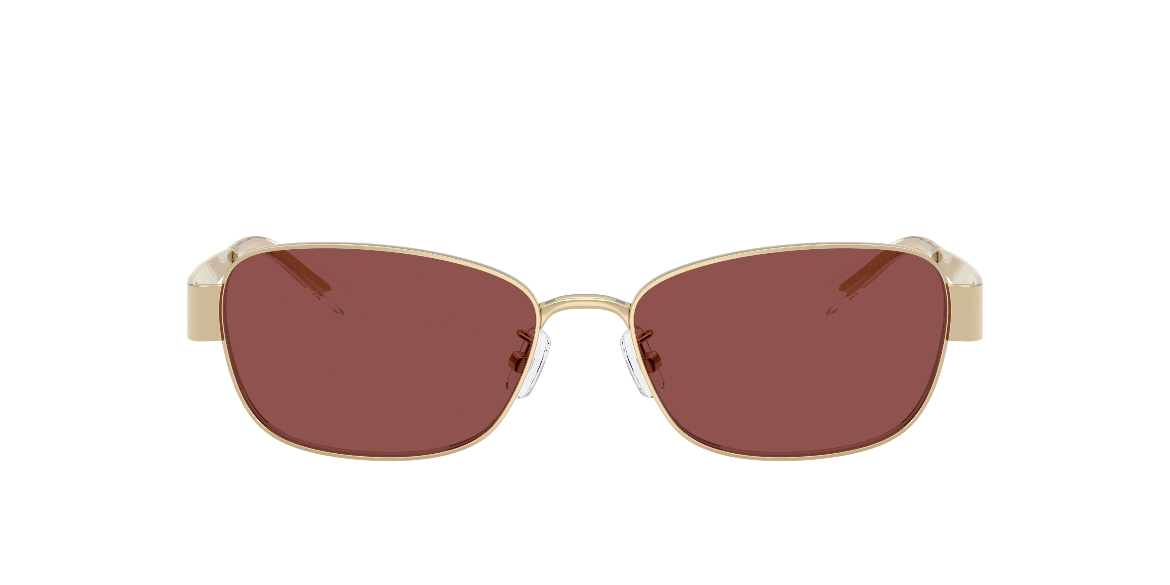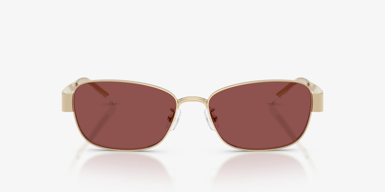 Discover timeless elegance with the Tory Burch TY6119 sunglasses. Crafted from lightweight metal, the sleek rectangular frames feature a refined gold finish that complements their clean, structured design. Violet lenses in a solid tint add a sophisticated touch, while adjustable nosepads sunglasses ensure a comfortable fit. Slender temples are adorned with the iconic Double T logo for a subtle yet striking detail.