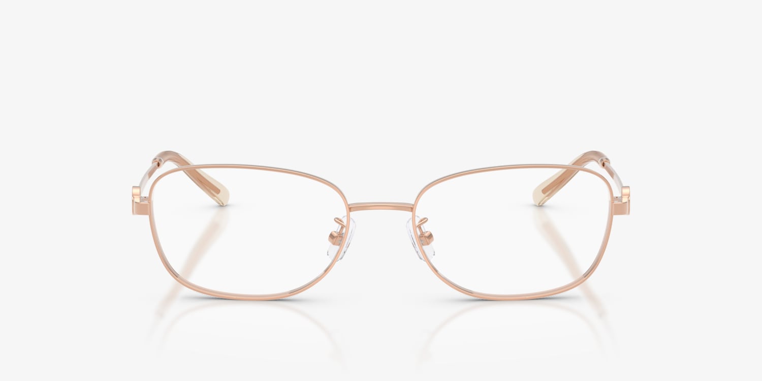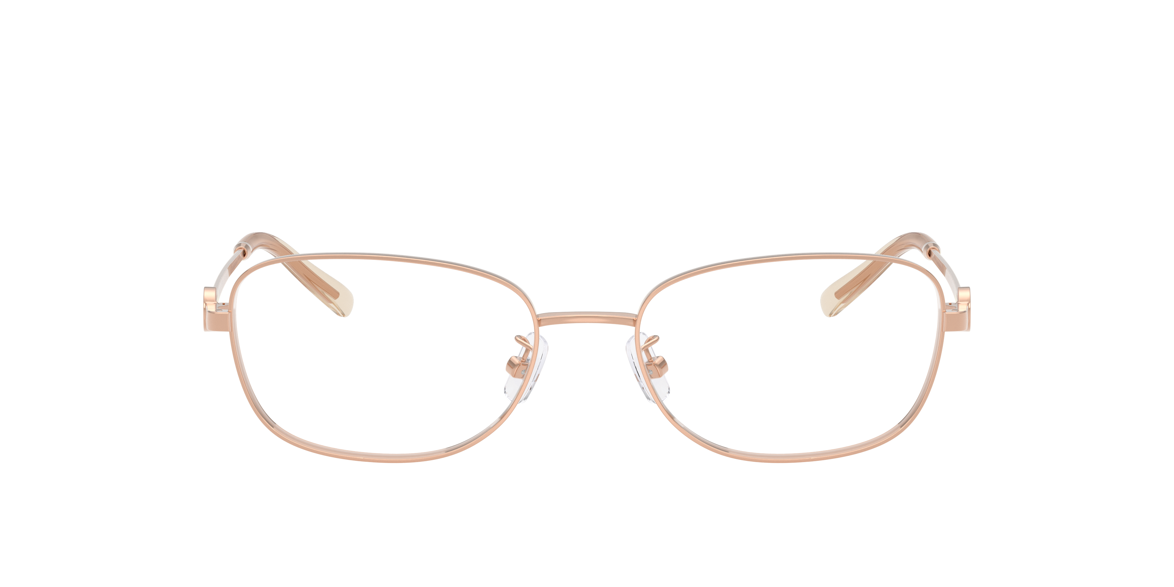The Tory Burch TY1098 optical eyeglasses showcase rectangular metal frames with softly rounded edges for a structured yet refined look. Designed with flat slender temples adorned with the iconic Double T logo, these glasses exude understated charm. Finished in pink/purple frames, they feature adjustable nosepads for enhanced comfort and fit. Perfect for adults seeking sleek sophistication.