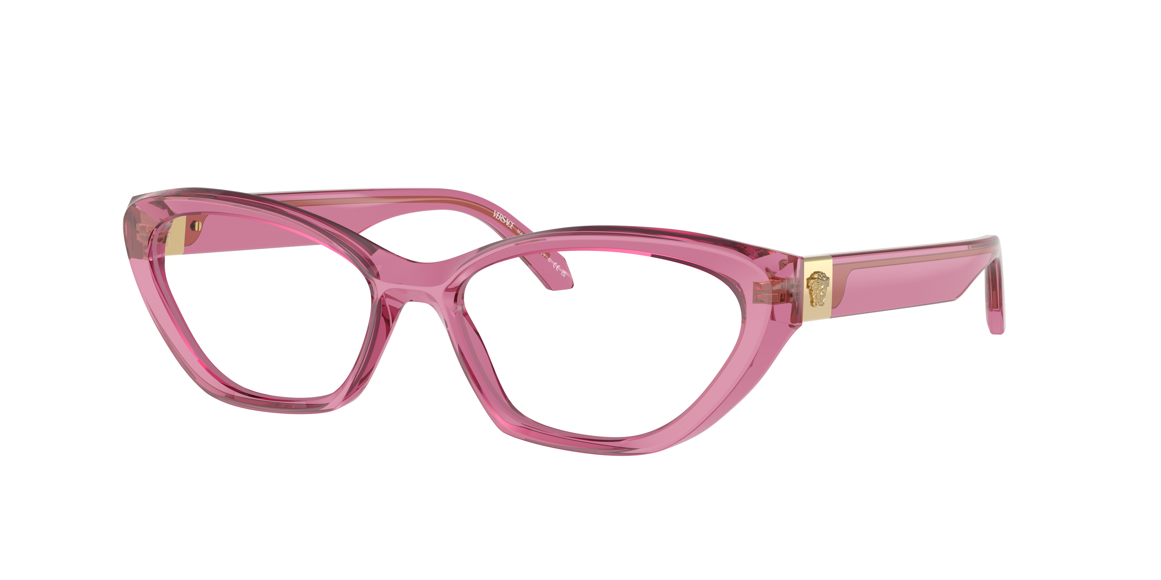 Elevate your style with Versace VE3356 optical frames. Crafted in a cat eye shape, these glasses feature a shiny transparent light pink acetate frame that adds a touch of sophistication to any look. The frame is designed to be lightweight and comfortable, making it the perfect accessory for everyday wear. With their unique design and impeccable craftsmanship, these glasses are a must-have addition to your fashion-forward wardrobe. Available with prescription lenses.