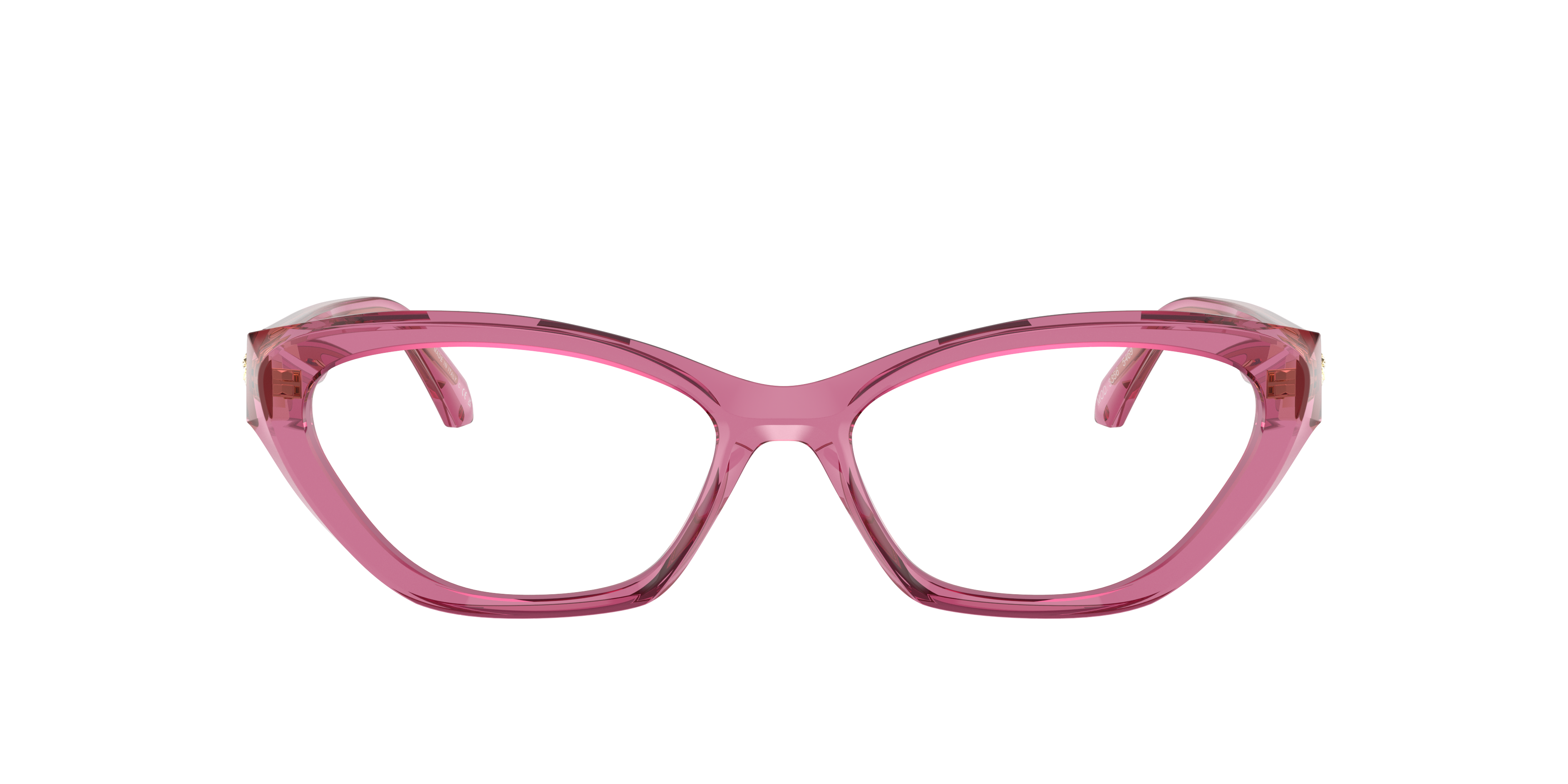 Elevate your style with Versace VE3356 optical frames. Crafted in a cat eye shape, these glasses feature a shiny transparent light pink acetate frame that adds a touch of sophistication to any look. The frame is designed to be lightweight and comfortable, making it the perfect accessory for everyday wear. With their unique design and impeccable craftsmanship, these glasses are a must-have addition to your fashion-forward wardrobe. Available with prescription lenses.