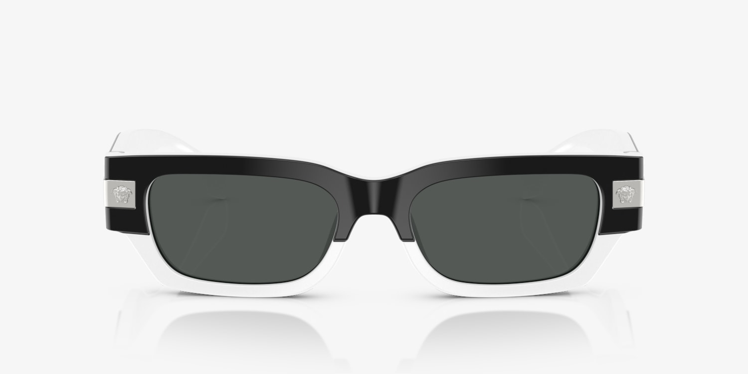 Experience the epitome of luxury and sophistication with Versace VE4465. These rectangle-shaped glasses feature a shiny top black/white acetate frame that adds a touch of elegance to any look. The solid dark grey lenses provide optimal clarity and protection, making these shades a perfect choice for everyday wear. Embrace the timeless style and quality craftsmanship that only Versace can offer. Available with prescription lenses.