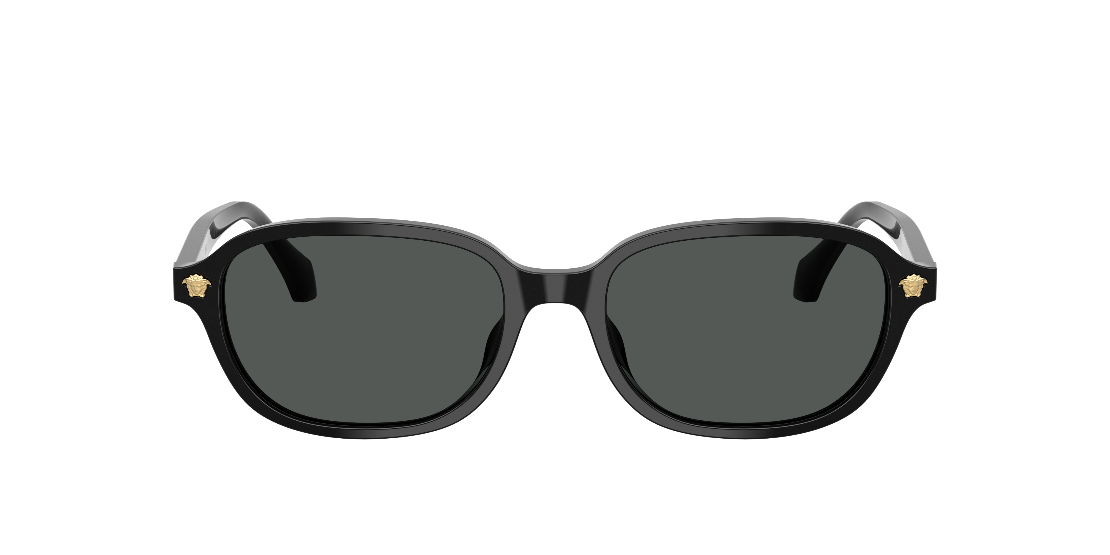 Versace VE4514D sunglasses embody refined sophistication. The black sunglasses feature pillow-shaped frames, crafted from sleek black plastic, offering a balanced and contemporary flair. Slim acetate temples accentuate the design, adorned with signature Medusa motifs for unmistakable Versace charm. Finished with solid grey lenses, these sunglasses ensure understated elegance with a low bridge fit inspired by Asian design.