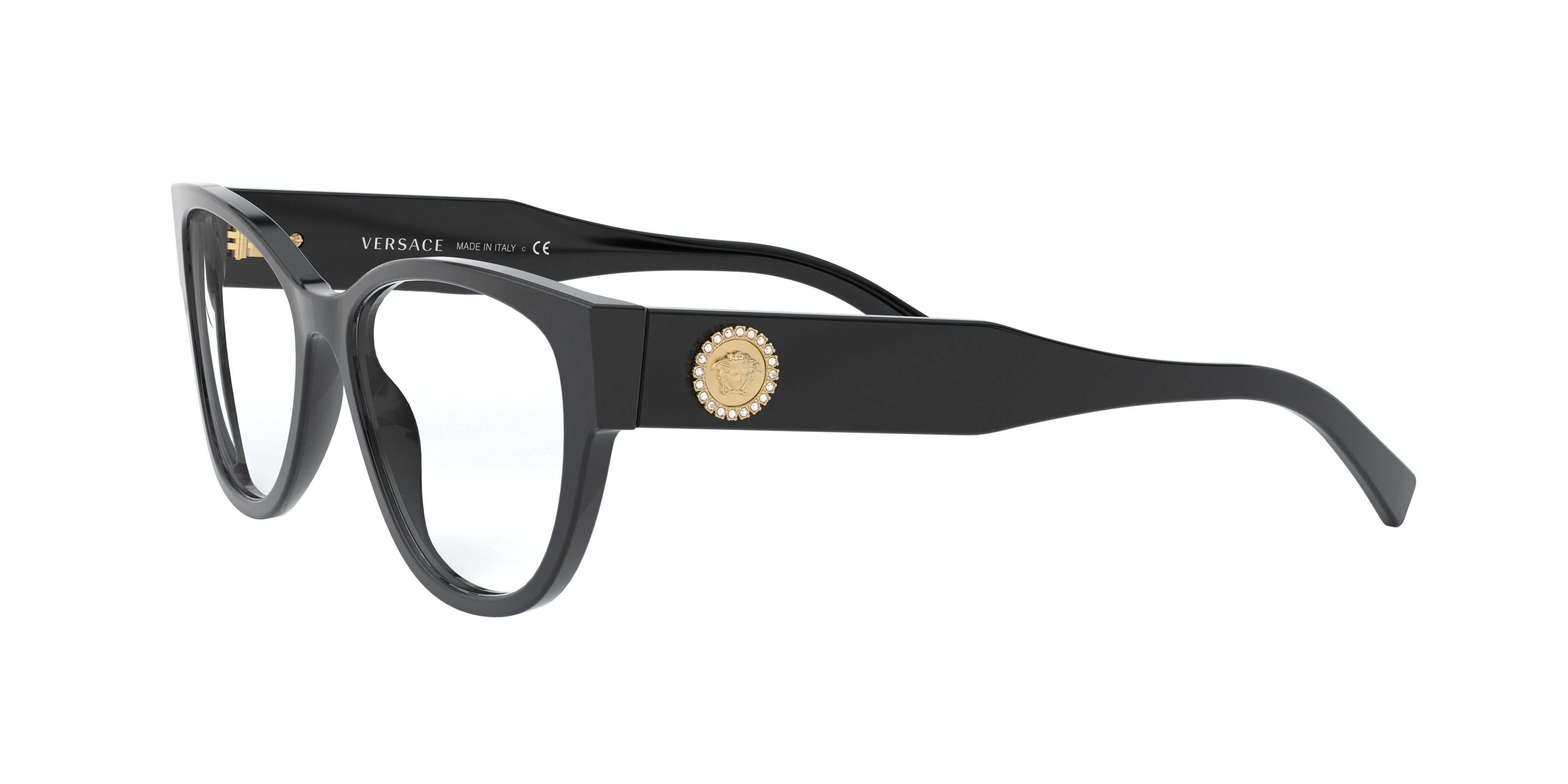 Elevate your fashion and vision with Versace VE3281B eyeglasses. The polished black acetate frame, accentuated by the cat eye shape, exudes a timeless appeal that is both elegant and chic. These glasses are further embellished with strass for added glamour. This unique design makes a statement wherever you go. Available with prescription lenses.
