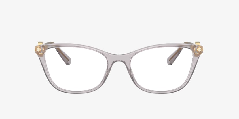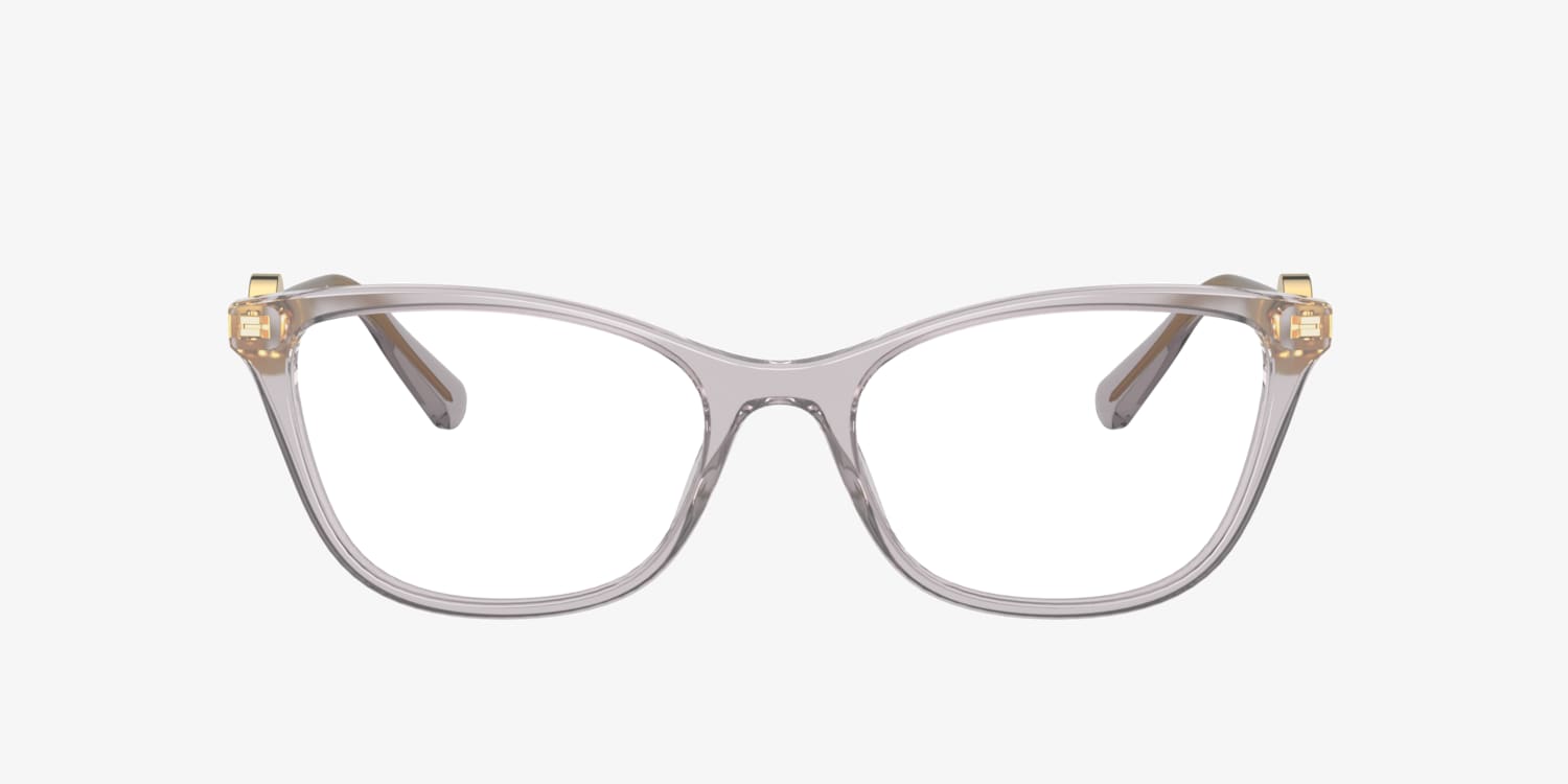 Elevate your fashion game with these Versace VE3293 eyeglasses. The polished transparent grey acetate frame in a cat eye shape adds a touch of glamour to any look. These glasses feature a unique design that is both stylish and practical. Embrace the synergy between aesthetics and functionality with this exquisite pair of eyewear. Available with prescription lenses.