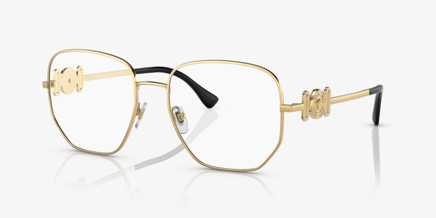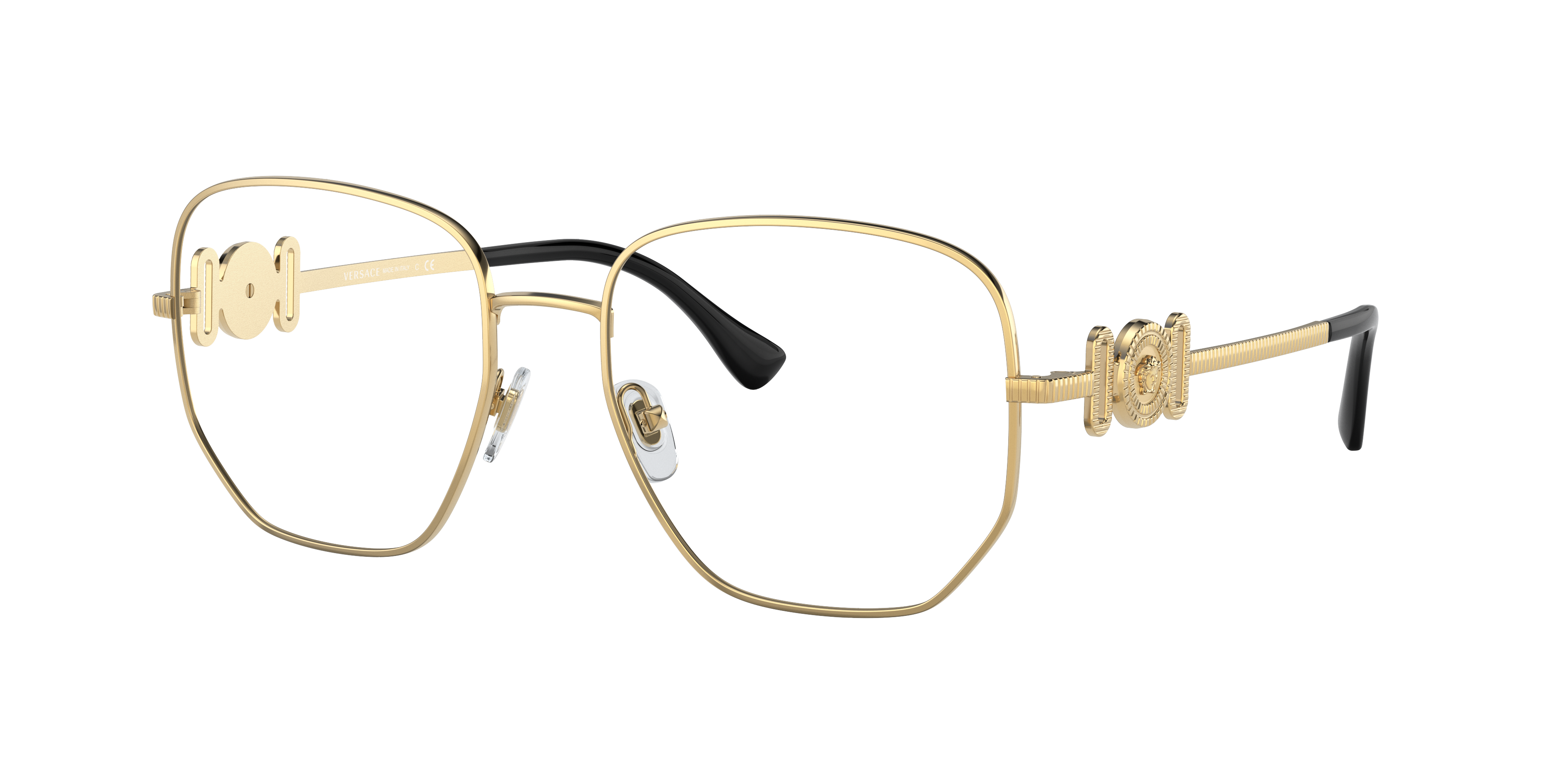 Introducing Versace VE1283 eyeglasses, a perfect fusion of style and comfort. Crafted from durable metal, these irregular-shaped glasses feature a polished gold finish that adds a touch of luxury to any look. The gold frame color is complemented by black accents on the temples, creating a striking contrast. These eyeglasses are not just stylish but also practical.