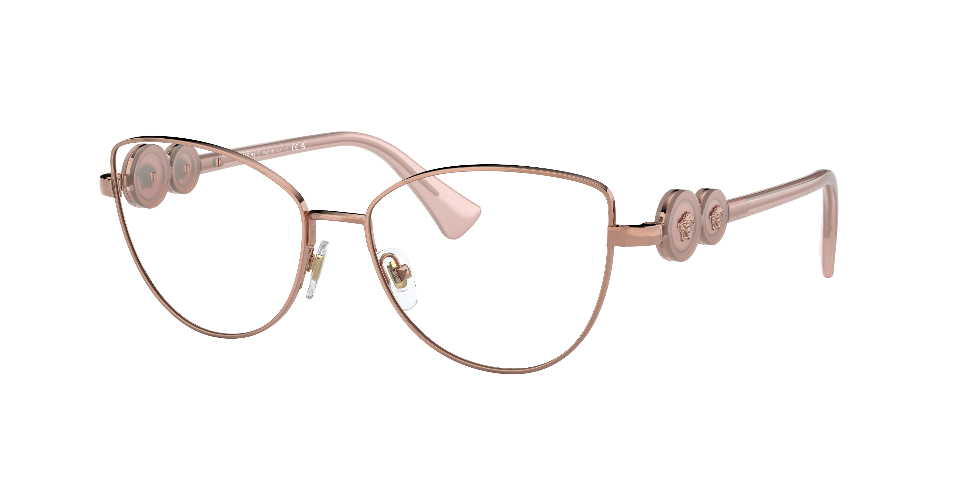 Elevate your look with these Versace VE1284 eyeglasses. The cay-eye shape, paired with a polished rose gold frame made of durable steel, offers a modern and sophisticated twist to the timeless design. These shades features a unique color scheme, making them the perfect accessory for those who want to stand out in style. Embrace your individuality while expressing your love for fashion with these stunning frames. Available with prescription lenses.