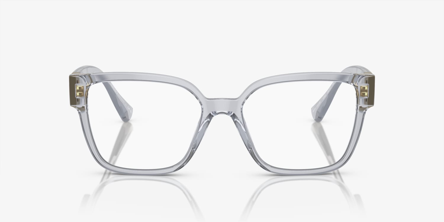 Elevate your fashion and vision with Versace VE3329B eyeglasses. Crafted from durable acetate, these square-shaped frames feature a polished transparent grey finish that is complemented by strass detailing for an added touch of glamour. The black color on the temples adds a sleek contrast to the overall design. These eyeglasses are not only stylish but also functional.