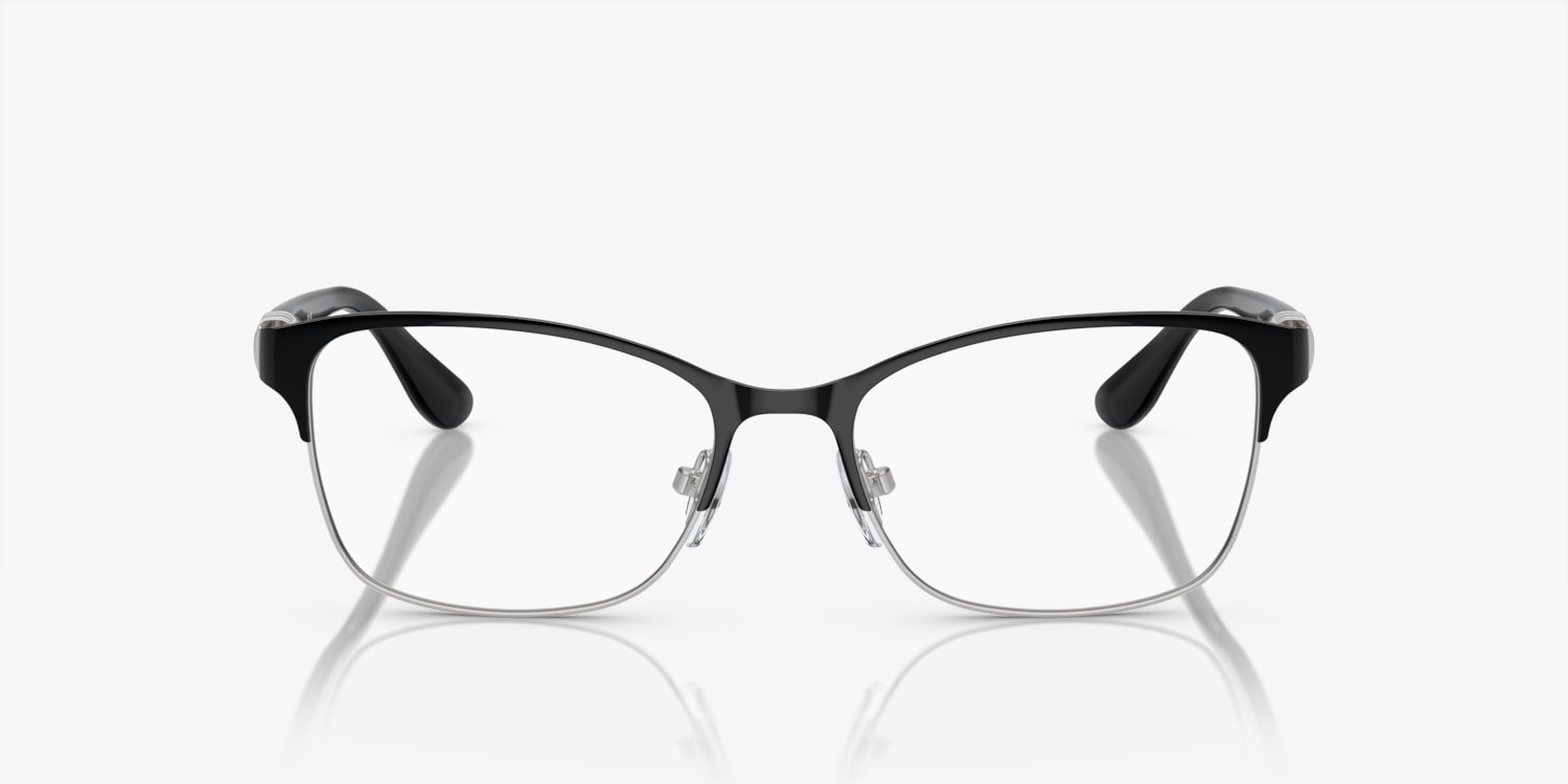 Elevate your fashion standards with Vogue Eyewear VO4050. The polished metal frame in a unique pillow shape offers a modern twist on a timeless design. The top black/silver color adds a touch of sophistication, while the saddle bridge ensures comfort and stability. These eyeglasses are not only stylish but also practical. Embrace your individuality with this eyewear from Vogue Eyewear. Available with prescription lenses.