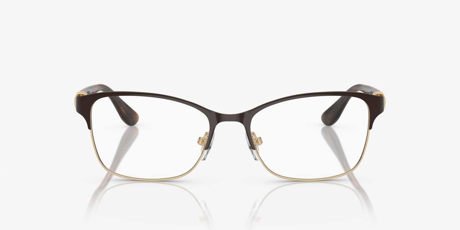 Elevate your fashion and optical standards with Vogue Eyewear VO4050 eyeglasses. The polished metal frame offers a sleek, modern look while the pillow shape adds a touch of vintage charm. The top brown/pale gold color is complemented by gold accents on the temples, creating a sophisticated yet casual aesthetic. These glasses feature a saddle bridge for added comfort, making them as practical as they are stylish. Available with prescription lenses.