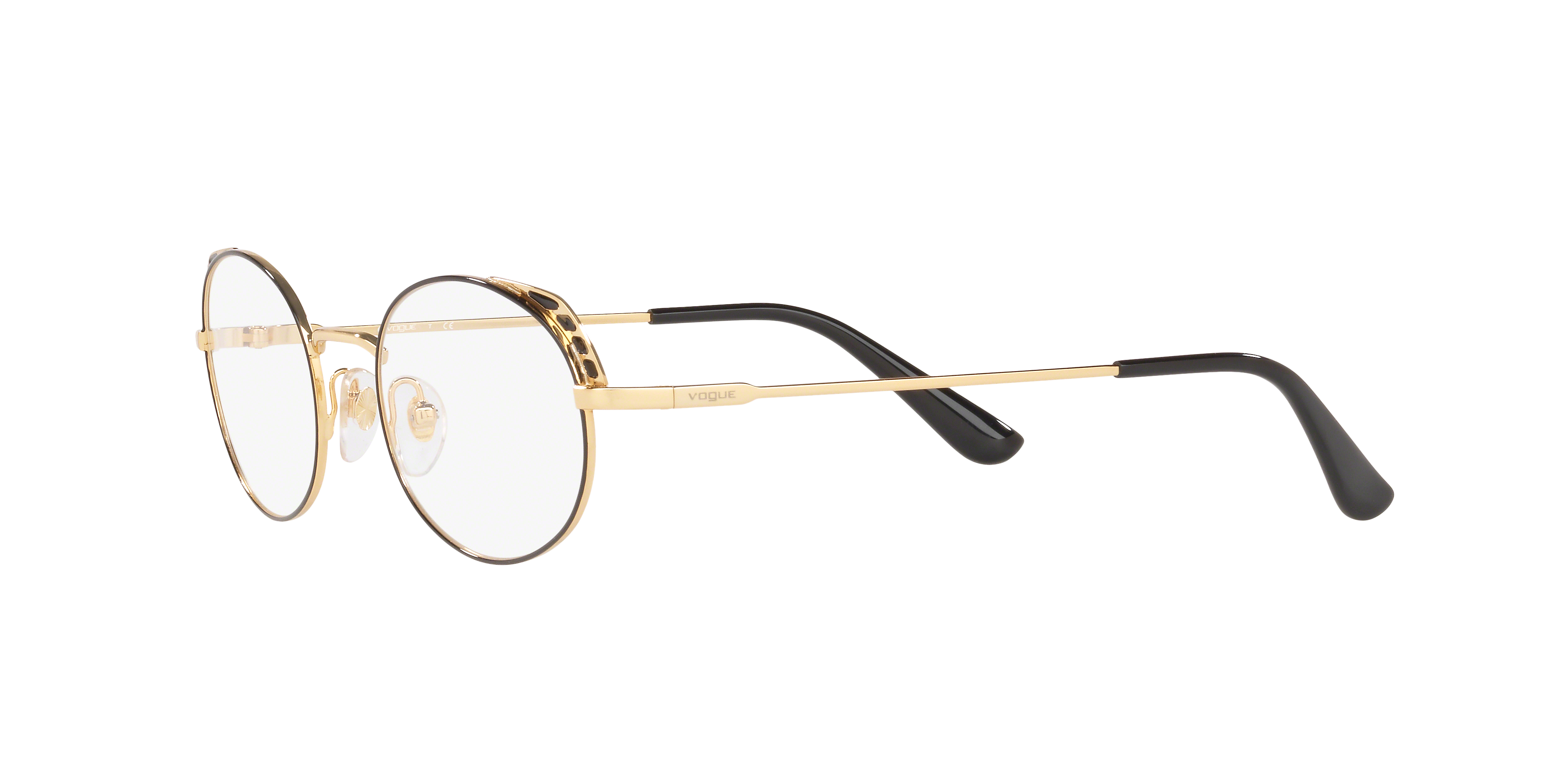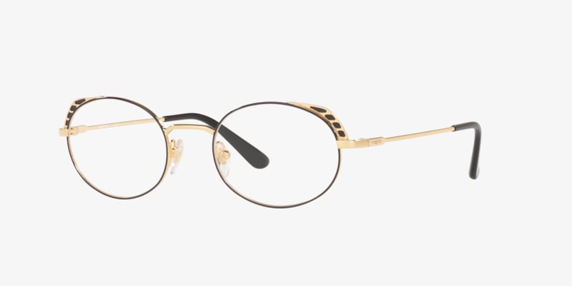 Experience the perfect blend of style and comfort with Vogue Eyewear VO4132 eyeglasses. The irregular shape adds a unique touch to your look, while the matte finish gives a sophisticated feel. Crafted from durable metal, these frames are designed to last. The top black/gold color scheme makes for a striking contrast that is sure to turn heads. These glasses are not just stylish but also practical. Available with prescription lenses.